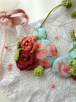 The photo tutorial for this necklace will guide you in making the roses, leaves and beads to adorn fabric covered (or regular) buttons. The tutorial does not show how buttons are covered, but I have supplied a link to a tutorial showing how to cover buttons with fabric. As a gift I have included a crochet ring with fabric button pattern. Materials: 1. Crochet yarn and hook (sport /1.9mm) (UK 3) (US 5) to make roses, leaves and buttons/ beads 2. Fabric covered buttons or regular buttons 3. Pearl beads, seed beads 4. Felt or fabric patch for the back (optional) 5. Tapestry needle for weaving and sewing needle and thread for sewing the pearls / beads. 6. Filling for the crocheted bead.
