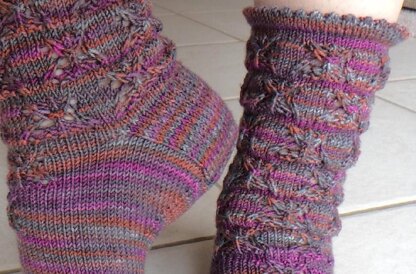 Lacy slip-stitch butterflies dance around this feminine sock with a picot cuff and double eye-of-partridge heel. This design was inspired by the Whirling Butterfly perennials that grow in my backyard; they dance in the breeze and attract butterflies and hummingbirds. The slip stitches enhance the shape of the butterflies and are pretty in both solid or variegated yarns.