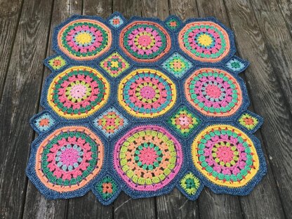 Nice size as shown for a baby blanket, baby floor mat, or lap throw, but can be expanded to any size square or rectangle, just leave the granny squares between the circles and the tiny grannies winking along the edges.
