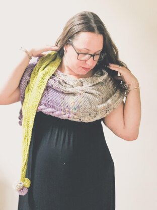 Gracenotes is a dk weight shawl which begins with a wide cast on edge, gently swooping towards a more narrow end. The cabled edge becomes more elongated as the shawl progresses, and the color melt allows for endless colorful opportunities. Alternately you can use a single color (or two!) to really make this shawl your own. Want to personalize it even more? Add some fun pom-poms to use up your scraps!