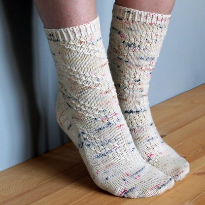 Gràdh means love or cherish in Scottish Gaelic and features a delicate pattern mirrored on each foot. The pattern is stunning with speckled yarns and also works beautifully with semi-solid yarns. Knit from the toe up with a gusset and heel flap, they’re sure to make an impression! With three widths and flexible length fitting, these are a great pattern for everyone.