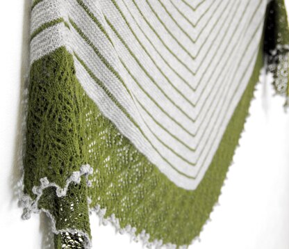 Grand Fir is a triangle-shaped shawl made with mindless garter stitch, accented with narrow stripes, and finished with a contrasting lace border and a decorative bobble bind-off (or an easier picot one). The shallow triangle shape creates a shawl that is wide rather than deep, making Grand Fir a wonderfully warm winter companion to wrap yourself in — once, twice, thrice!