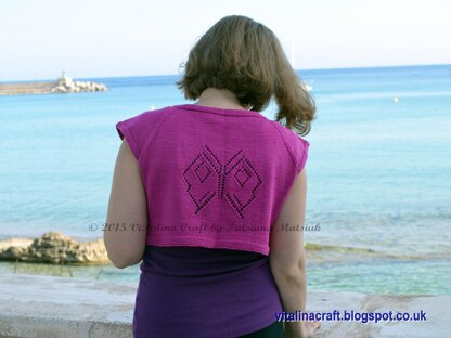 Grand Papillon Bolero is a quick and easy summer knitting project. This bolero is an ideal garment for hot summer days which turns any outfit into a stylish feminine look. This beautiful bolero is knitted bottom up as one piece with no seams. It has beautiful lace butterfly on the back and raglan sleeves. The bolero is made in beautiful dark pink color with cotton yarn. My knitting pattern is easy to follow and suitable for advanced beginners. It contains five pages of written instructions, butterfly chart with row-by-row instructions and picture.