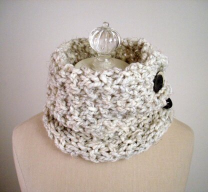 Super easy and quick knit - great for beginning knitters. Love the versatility - button up as a cowl or to the side/one corner/etc. for a neckwarmer.