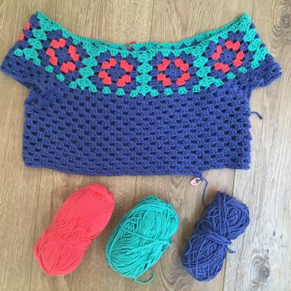 The Granny Square Bardot pattern has been put through it’s paces by nine fantastic ladies, using both the suggested and alternative aran yarns.   #grannysquarebardotjumper
