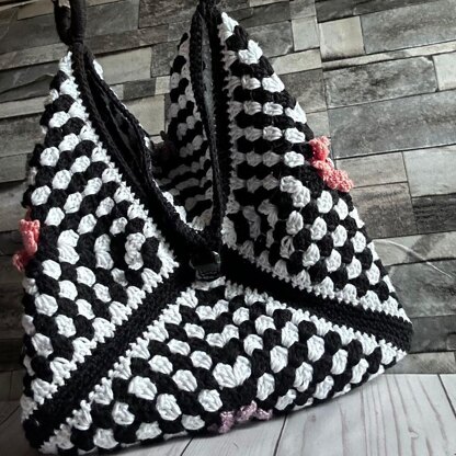 This fresh take on the granny square bag crochet pattern has flowers, an optional sparkle accent in flower center and a checkerboard look that makes a bold statement.