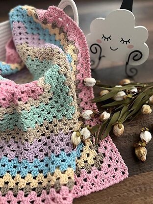 Granny Swaddler is a blanket that combines classic elements with a modern twist. Gorgeous puffy texture and a simple granny square structure creates a finished blanket that will be loved for years. This popular granny square is one that starts from the center and continues to grow until you run out of yarn or reach your desired size. It’s finished with the crab stitch around the outside. A great scrappy project. Think of all the colors you can use with leftover worsted weight yarn.