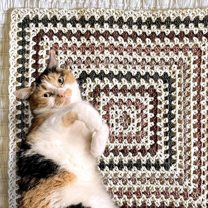 An easy project that works up fast, great for beginners. This blanket is sized for a cat (or small dog) to lay on and fit atop most couch cushions, but the pattern is quite versatile with a 3 round repeat similar to a continuous granny square (plus an easy border) so feel free to size up or down by adding or subtracting rounds to get the size you want. Would work well for a lap blanket, throw, granny square, pillow cover, etc.