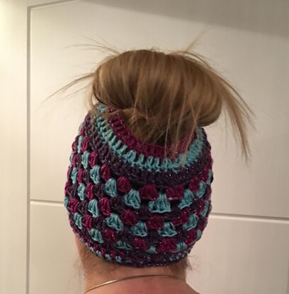 I created this hat when I saw other messy bun hats but wanted something that looked a bit different. This hat works up really quickly and can easily be crocheted in one evening. It's great for a last minute present!
