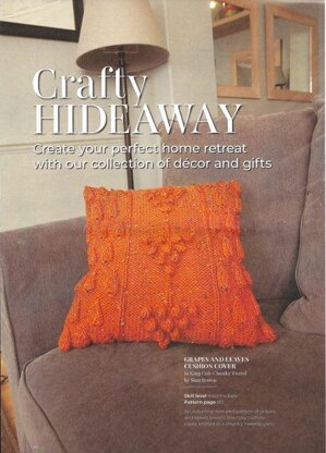 This is a pattern for a grapes and leaves cushion cover, originally published in Knitting magazine. It has a stocking stitch back, grapes and leaves textured front, and moss stitch edges. You will need 3 x 100 gm balls of yarn and 5 x buttons. Photos Knitting magazine.