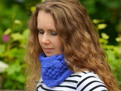 This bright blue cowl with textured pattern is stylish, warm and comfortable. It is knitted with Aran weight wool and decorated with beautiful bunch of grapes and leaf. This beautiful accessory can be worn with coat, jacket or even with your favorite jumper.