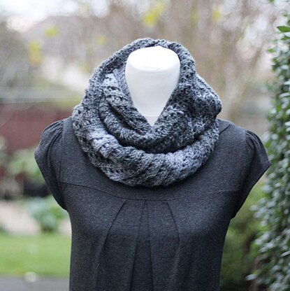 Grey Marl infinity scarf/cowl features diagonal lace pattern, knit in chunky weight yarn.