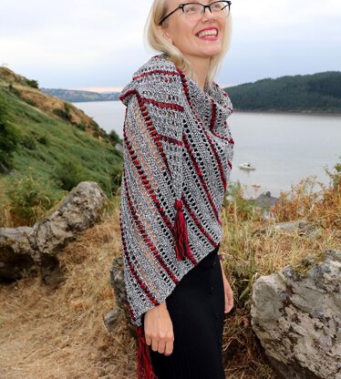 An asymmetric shawl design with a beautiful drape, using approx. 650g of fingering weight yarn (you can use any fingering weight yarn of your choice) and approx. 50g of a contrast colour from your stash.