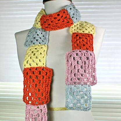 Fun colors and asymmetric construction make this funky granny square scarf a fun, quick project to crochet.