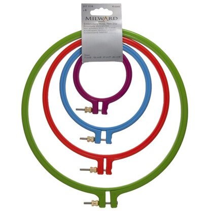 Non-slip Embroidery Hoop SetSuitable for all fabric bases from slippery organza to heavy denim, the hoops groove design makes these pieces lock together when tightened and stops any slipping.The set comprises of 4 popular sized hoops suitable for all project sizes: 3in (7.6cm), 5in (12.7cm), 7in (17.8cm) and 9in (22.9cm). Each hoop a different colour to make it easy to select the correct size for the project. 100% Polyester.