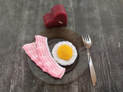 Detailed Knitted Bacon and Eggs toy food knitting pattern in English. Breakfast includes an egg, a strip of fried bacon
