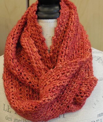 The pattern begins with a simple moebius strip and includes a Cross-Over Long Double Crochet that creates a unique design. This is mimicked in the edge stitch.