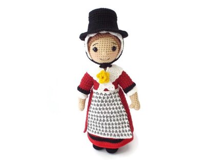 Say hello to Gwen, she loves to dress up in her welsh traditional costume. She just loves all things Wales, and especially loves the national flower, the daffodil! Gwen is an amigurumi doll wearing a petticoat, gown, boots, apron, shawl, cap and hat. The outfit is similar to other historical costumes.
