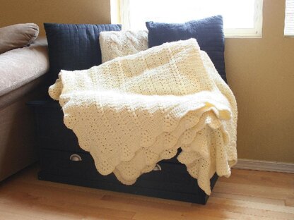This afghan blanket throw was designed for my mother-in-law Madeleine. Hence the name! - It features vertical rows of alternating puff stitches and shells. It's done with a double strand throughout, making it a very heavy and warm afghan! A wide ruffle finishes it off. Pattern is detailed and easy to follow!