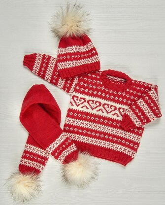 There is nothing better than the pop of red and white to showcase this Norwegian inspired set! A band of stylized hearts are placed strategically within two related fair-isle sections to add “girly” appeal. The pullover is worked in the round to the armholes, then the body is divided for front and back to be worked separately back and forth in rows. The sleeves are also worked in the round and sewn into the armhole opening. The hat and matching scarf echo the patterning of the pullover to bring the set full circle. What girl wouldn’t love this look?
