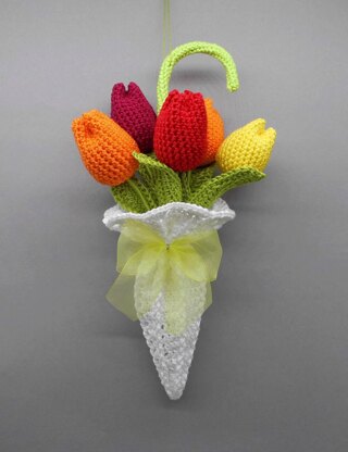 Häkel-Deko Tulpen im Regenschirm für Tür und Tisch - aus Wollresten