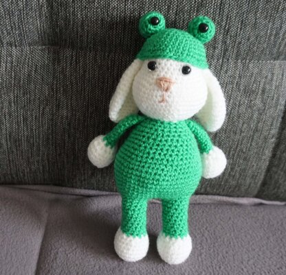 Hier bieten wir Ihnen unsere Häkelanleitung für den Hasen Lilly im Froschkostüm an!