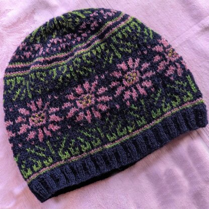 This is a pattern for a slightly slouchy beanie style hat worked from the brim rib up and in the round using the stranded colourwork knitting technique.