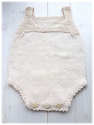 You will start off with working Front crutch and Back crutch separately, and then join them on a circular needle, and continue in the round. You will divide in Back and Front again when you begin shaping the armholes. To finish you will crochet a cute edge along the leg openings and buttonbands and sew in buttons.