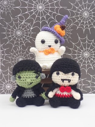 Skill Level: IntermediateMaterials:**Frankie• Yarn: Any Aran/worsted weight acrylic yarn of your choice: Green, Black, & GreyBoo the Ghost**• Yarn: Any Aran/worsted weight yarn of your choice: White, Orange, Brown, Purple & small amount of BlackVlad the Vampire• Yarn: Any Aran/worsted weight acrylic yarn of your choice: Skin Color, Black, White & Red