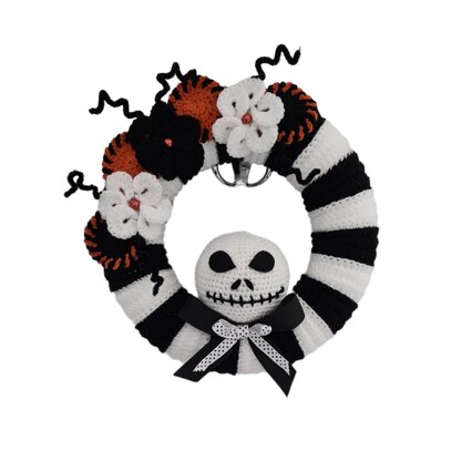 A fun, crochet wreath pattern for Halloween. With a creepy skeleton head as the focal point and spooky colour pallet, this will add to your halloween decor
