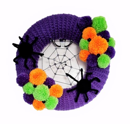 Pattern includes: - Wreath cover instructions and photos - Pom Pom instructions - Instructions for spiders - Instructions on how to make the web