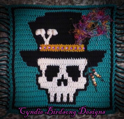 This VooDoo Daddy Skull square uses the overlay mosaic crochet technique with some color switching in some rows for added detail. This square can be used in other types of projects, such as blankets, pillows, satchel bags, table mats, etc.