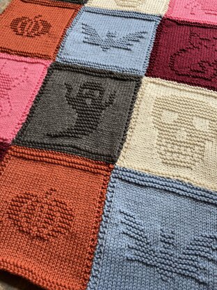 This is a fun Halloween addition to my patchwork blanket collection. These 6 square patterns are made up of only knit and purl stitches.