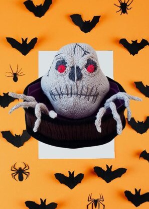 This 6-page knitting pattern is packed with spooky charm; from bony skeleton hands to a red-eyed skull peeking over the edge of a sweet tub. He’s ready to startle any trick-or-treater brave enough to reach for a chocolate!