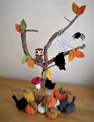 I love to crochet a tree branch (more a big twig really) and add all the things you would find in a tree. So here I have created a Halloween Spooky version for you to make. I have included Bats, Cats, an Owl and a Spider. Also Pumpkins, Toadstool and autumn leaves. It is super fun to make. It takes time to find just the right branch, so in the mean time you can make all the characters ready to decorate your tree. You could even add lights for extra spookiness :) in the dark.