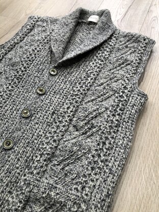 A great year-round waistcoat with neat roll collar and pockets. The aran style panels have blocks of slanting cables framed on each side by neat little 2-stitch cables. The background is in broken rib, also known as rice stitch. Worked bottom up and with full written instructions.