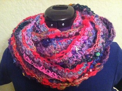 This is an easy pattern that I made from all the leftovers of handspun yarns in the same color family, some of the handspun I made has beads in it and some have charms spun in too. I even used an overtwisted crazy tryout of a new spinning technique yarn that I love. You can make you scarf as wide or long as you want or you can wear it double or leave it long, it's all up to you and what you fancy :)