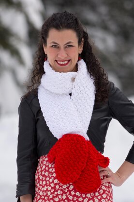 This cozy keyhole scarf features two mock mittens at the end.