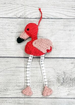 Crochet a whimsical, fun, hanging flamingo, with dangly ribbon legs. A cute tropical decoration for anywhere in your home or garden! This pattern also includes a bonus mini size! This makes a perfect keychain or bag pull!