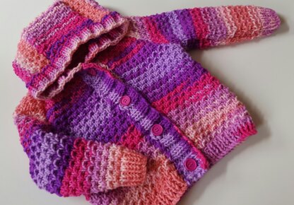 A lovely, easy to knit hooded cardigan designed especially for active toddlers. Ideal for slipping on for car journeys or trips to the park.