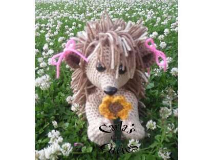 Hannah is approx. 9 inches tall. Buff and Cafe Latte are the main colors. A small amount of Gold and Hunter Green is also needed for the flower. I used 15mm safety eyes, and a medium size animal nose.