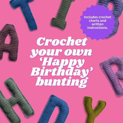 This PDF pattern guide contains written instructions and crochet charts for the following letters. H, A, P, Y, B, I, R, T, D.