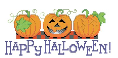 By Linda Gillum. PDF Download - Three charming pumpkins, including one carved Jack-O-Lantern, sit atop a checker-board border declaring a Happy Halloween to all. You can stitch this design onto a canvas tote bag using waste canvas to make a cherished Trick-or-Treat bag for a special child.