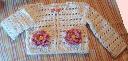 A happy little jacket that looks well over a sleeveless dress. The pockets are trimmed with crocheted flowers and buttons.