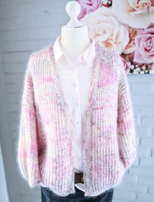Durch Waschen und vorsichtiges Spannen, kann der Cardigan noch etwas breiter und länger werden.
