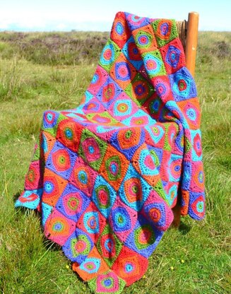 Each square measures 12 cm/4.5” (blocked) The blanket measures approx. 112 cm x 122 cm/44 x 48 inches