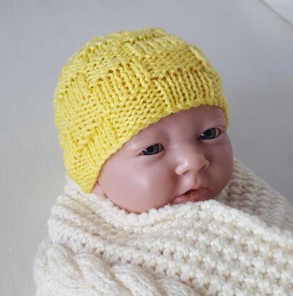 This 8ply Beanie is worked in an easy block stitch. This design will suit either a baby girl or boy and the pattern includes three prem sizes and a newborn size.