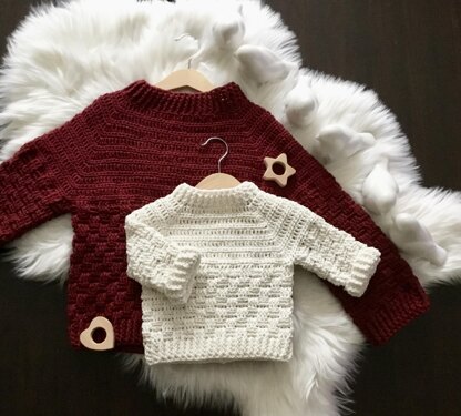 Harmony Basketweave Sweater is a stylish, modern sweater for both girls and boys. It will keep your baby extra cozy or make perfect gift. Beginner friendly sweater can be made with cotton blend yarn for spring or wool yarn for colder seasons.