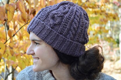 The Harris Cap is a modern take on a classic cabled hat. Knit from the bottom up in the round it features a folded ribbed cuff, simple cables, textured stitch columns and more intricate cables which run up the cap. Decreases are worked in the crown for a smooth, and pretty crown shaping. Written rounds and charts are provided for cables to follow whichever way you prefer. Knit up in just one skein of Ritual Dyes Elder yarn, a woolly, soft yarn that is perfect for showcasing the intricate cables!