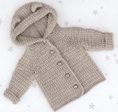 Crocheted from the top down, this pattern creates the jacket in one piece, so the only sewing required is for the buttons and to attach the bear ears.